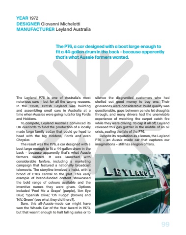 99The Leyland P76 is one of Australia%u2019s most notorious cars %u2013 but for all the wrong reasons. In%u00a0 the 1960s, British Leyland was building and%u00a0 assembling small cars in Australia at a time%u00a0when Aussies were going nuts for big Fords and Holdens.To compete, Leyland Australia convinced its UK overlords to fund the production of a locally made large family sedan that could go head to head with the big Holdens, Fords and even Chrysler.The result was the P76, a car designed with a boot large enough to fit a 44-gallon drum in the back %u2013 because apparently that%u2019s what Aussie farmers wanted. It was launched with considerable fanfare, including a marketing campaign that featured a nationally broadcast telemovie. The storyline involved a heist, with a brood of P76s central to the plot. This early example of brand-funded content showcased the bold range of colours available and the inventive names they were given. Options included %u2018Peel Me a Grape%u2019 (purple), %u2018Am Eye Blue%u2019, %u2018Spanish Olive,%u2019 %u2018Oh Fudge%u2019 (brown) and %u2018N.V. Green%u2019 (see what they did there?).Sure, this all-Aussie-made car might have won the Wheels Car of the Year Award in 1973, but that wasn%u2019t enough to halt falling sales or to silence the disgruntled customers who had shelled out good money to buy one. Their grievances were considerable: build quality was questionable, gaps between panels let draughts through, and many drivers had the unenviable experience of watching the carpet catch fire while they were driving. To cap it all o%u00a0, Leyland released this gas guzzler in the middle of an oil crisis, sealing the fate of the P76.Despite its reputation as a lemon, the Leyland P76 %u2013 an Aussie made car that captures our imaginations %u2013 still has a legion of fans.YEAR 1972DESIGNER Giovanni MichelottiMANUFACTURER Leyland AustraliaThe P76, a car designed with a boot large enough to fit a 44-gallon drum in the back %u2013 because apparently that%u2019s what Aussie farmers wanted.