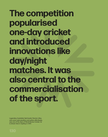 130The competition popularised one-day cricket and introduced innovations like day/night matches. It was also central to the commercialisation of the sport.Legendary Australian fast bowler Dennis Lillee, who wore male jewellery and yellow e%u008b ortlessly, was one of the stars of World%u00a0Series Cricket; he is shown here in Sydney in 1979