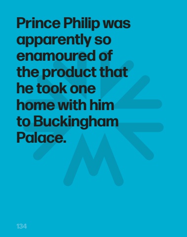 134Prince Philip was apparently so enamoured of the product that he took one home with him to Buckingham Palace.