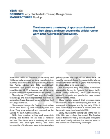 141Australian tari%u00a0s on footwear in the 1970s and 1980s not only propped up local manufacturing, but they also made the marque running brands like Puma, adidas and Nike prohibitively expensive. This paved the way for the muchloved Dunlop KT 26 to become one of the most popular and iconic sports shoes of the period. The original KT 26 (KT was short for kinetic technology, and the 26 represented the miles in a marathon) was designed by Jerry Stubberfield for Osaga in the US. They caught the eye of a Dunlop rep at a shoe fair in New York City, and a licensing deal was done. They were adapted and released as the Dunlop KT 26 in Australia in 1978. With their modern styling and accessible pricing, the humble KT 26 was a runaway success. The shoes were a mainstay of sports carnivals and blue-light discos, and even became the o%u00a0icial runner worn in the Australian prison system. The original %u2018Dad Shoe%u2019, the KT 26 was the runner of choice if you wanted to take up exercise for the first time in years, with hamstring injuries added at no extra cost.For many years they were made at Dunlop%u2019s Alexandria factory in Sydney, but when tari%u00a0s were slowly removed, local manufacturing couldn%u2019t compete and production was moved o%u00a0shore in the 1990s. Many purists argued that overseas-made shoes didn%u2019t have the same quality, but the KT 26 managed to hang on, and by the early 2000s it was claimed that more than 5 million pairs had been sold since their launch in 1978. Sadly, however, the writing was on the wall for this little sports shoe that could. The humble runner that never really looked good with jeans and wasn%u2019t really suitable for exercise went to the farm in 2014 with barely a whimper. YEAR 1978DESIGNER Jerry Stubberfield/Dunlop Design TeamMANUFACTURER DunlopThe shoes were a mainstay of sports carnivals and blue-light discos, and even became the official runner worn in the Australian prison system.