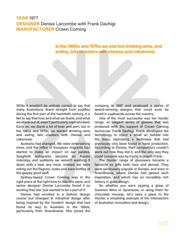 145In the 1960s and 1970s we started drinking wine, and eating Jatz crackers with cheese and cabanossi.While it wouldn%u2019t be entirely correct to say that many Australians drank straight from puddles during the first part of the twentieth century, it is fair to say that how and what we drank, and what we drank out of, wasn%u2019t particularly sophisticated. Early on, we drank a lot of beer and port, but in the 1960s and 1970s, we started drinking wine and eating Jatz crackers with cheese and cabanossi. Australia had changed. We were entertaining more, and the influx of European migrants had started to make an impact on our palates. Spaghetti bolognese became an Aussie mainstay, and suddenly we weren%u2019t washing it down with a beer any more. Instead, we were rolling out the flagons, casks and even bottles of the grapey good stu%u00a0 . Sydney-based Crown Corning was in the right place at the right time to ride this wave, and senior designer Denise Larcombe found it so exciting that she %u2018just wanted to be a part of it%u2019. Denise had enrolled in a fashion design course but changed to industrial design after being inspired by the %u2018modern%u2019 design that had found its way to Australia in the 1960s, particularly from Scandinavia. She joined the company in 1967 and produced a series of award-winning designs that could soon be found in cupboards across the country. One of the most successful was her Hunter range, an elegant series of glasses that was produced with the support of Crown Corning technician Frank Davhigi. Frank developed the technology to inject a small air bubble into the%u00a0 base, replicating a technique that had previously only been found in hand production. According to Denise, their competitors couldn%u2019t work out how they did it, and the only way they could compete was by trying to poach Frank. The Hunter range of glassware became a favourite as gifts both here and abroad. They were particularly popular in Europe, and even in Scandinavia, where Denise had gained such inspiration, and which has an incredibly rich history in glass design. So whether you were sipping a glass of Summer Wine or Spumante, or using them for chocolate mousse, let%u2019s raise a glass to the Hunter, a smashing example of the intersection of Australian innovation and design. YEAR 1977DESIGNER Denise Larcombe with Frank DavhigiMANUFACTURER Crown Corning