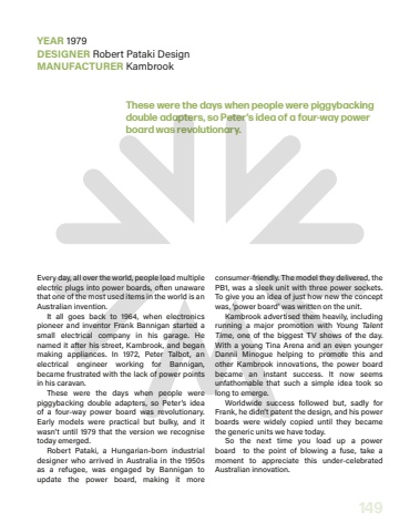 149These were the days when people were piggybacking double adapters, so Peter%u2019s idea of a four-way power board was revolutionary. Every day, all over the world, people load multiple electric plugs into power boards, often unaware that one of the most used items in the world is an Australian invention.It all goes back to 1964, when electronics pioneer and inventor Frank Bannigan started a small electrical company in his garage. He named it after his street, Kambrook, and began making appliances. In 1972, Peter Talbot, an electrical engineer working for Bannigan, became frustrated with the lack of power points in his caravan.These were the days when people were piggybacking double adapters, so Peter%u2019s idea of%u00a0 a four-way power board was revolutionary. Early models were practical but bulky, and it wasn%u2019t until 1979 that the version we recognise today emerged.Robert Pataki, a Hungarian-born industrial designer who arrived in Australia in the 1950s as a refugee, was engaged by Bannigan to update the power board, making it more consumer-friendly. The model they delivered, the PB1, was a sleek unit with three power sockets. To give you an idea of just how new the concept was, %u2018power board%u2019 was written on the unit.Kambrook advertised them heavily, including running a major promotion with%u00a0 Young Talent Time, one of the biggest TV shows of the day. With a young Tina Arena and an even younger Dannii Minogue helping to promote this and other Kambrook innovations, the power board became an instant success. It now seems unfathomable that such a simple idea took so long to emerge.Worldwide success followed but, sadly for Frank, he didn%u2019t patent the design, and his power boards were widely copied until they became the generic units we have today.So the next time you load up a power board %u00a0 to%u00a0 the point of blowing a fuse, take a moment to%u00a0 appreciate this under-celebrated Australian innovation.YEAR 1979DESIGNER Robert Pataki DesignMANUFACTURER Kambrook