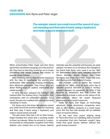 151The sampler meant you could record the sound of your cat meowing and then play it back using a keyboard, and make it sound weird and stuff.When schoolmates Peter Vogel and Kim Ryrie spent their lunchtimes hanging out in the science lab, they had no idea they would go on to create something that would change the course of popular music forever.After finishing school, they became obsessed with the idea of developing the world%u2019s best synthesiser. After licensing existing technology from Motorola consultant Tony Furse, they set about finding ways to capture, manipulate and create sounds.In 1979, the pair released the Fairlight CMI (named after the Sydney ferry), the world%u2019s first workstation with an embedded sampler. As a result, the duo are credited with coining the term %u2018sampling%u2019 in music.For those not in the know, the sampler meant you could record the sound of your cat meowing and then play it back using a keyboard, and make it sound weird and stu%u00a0.The pair knew they had a hit on their hands. Vogel travelled the world with a working model to drum up interest. When he arrived in London, he received an enthusiastic reception from Peter Gabriel, who invited him to his house. Gabriel instantly saw the potential and became an early adopter. He went on to introduce the Fairlight to his friend Kate Bush, who used it on her 1980 hit%u00a0 %u2018Babooshka%u2019. Other early adopters included Stevie Wonder, Duran Duran, Yes, Todd Rundgren and Devo. For a time, Vogel was even distributing units from Gabriel%u2019s house.The Fairlight came to define the musical sound of the 1980s. Even its hefty price tag of $25,000 (around $127,000 in today%u2019s money) couldn%u2019t dampen its popularity. By 1985, it had become so ubiquitous that Phil Collins felt compelled to include a note on the sleeve of his multi-platinum album%u00a0 No Jacket Requiredexplaining that he hadn%u2019t used one.Sadly for Ryrie and Vogel, as technology advanced, major electronics companies were able to o%u00a0er similar products at a much lower price. But the duo had already left an indelible mark on musical history.So the next time you%u2019re singing along to%u00a0%u2018You%u2019re the Voice%u2019%u00a0at a wedding, take a moment to remember that John Farnham couldn%u2019t have made that great Aussie anthem without this great Aussie invention.YEAR 1979DESIGNERS Kim Ryrie and Peter Vogel