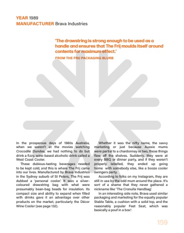 159In the prosperous days of 1980s Australia, when%u00a0 we weren%u2019t at the movies%u00a0 watching%u00a0Crocodile Dundee, we had nothing to do but drink a fizzy, wine-based alcoholic drink called a West Coast%u00a0Cooler.These dubious-tasting beverages needed to%u00a0be kept cold, and this is where The Frij came into our lives. Manufactured by Brava Industries in the Sydney suburb of St Peters, The Frij was dubbed a %u2018personal cooler%u2019. It was a silvercoloured drawstring bag with what were presumably bean-bag beads for insulation. Its compact size and ability to expand when filled with drinks gave it an advantage over other products on the market, particularly the D%u00e9cor Wine Cooler (see page 132).%u2018The drawstring is strong enough to be used as a handle and ensures that The Frij moulds itself around contents for maximum effect.%u2019%u0009%u0017ff%u0011ffi%u000efi%u0015ffi%u0009%u0017%u001a%u0090ffi%u0013%u0016%u000f%u0006%u0016%u001a%u0014ffi%u0010%u0018%u0017%u0010YEAR 1989MANUFACTURER Brava IndustriesWhether it was the nifty name, the savvy marketing or just because Aussie mums were%u00a0partial to a chardonnay or two, these things flew o%u00a0 the shelves. Suddenly, they were at every%u00a0 BBQ or dinner party, and if they weren%u2019t properly labelled, they ended up going home %u00a0with somebody else, like a booze cooler swingers party.According to folks on my Instagram, they are still in use by the odd mum around the place. It%u2019s sort of a shame that they never gathered a nickname like %u2018The Cronulla Handbag%u2019.In an interesting side note, Brava used similar packaging and marketing for the equally popular Stable Table, a cushion with a solid top, and the reasonably popular Feet Seat, which was basically a pouf in a box!