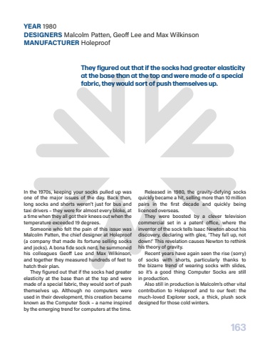 163They figured out that if the socks had greater elasticity at the base than at the top and were made of a special fabric, they would sort of push themselves up.In the 1970s, keeping your socks pulled up was one of the major issues of the day. Back then, long socks and shorts weren%u2019t just for bus and taxi drivers %u2013 they were for almost every bloke, at a time when they all got their knees out when the temperature exceeded 19 degrees.Someone who felt the pain of this issue was Malcolm Patten, the chief designer at Holeproof (a company that made its fortune selling socks and jocks). A bona fide sock nerd, he summoned his colleagues Geo%u00a0 Lee and Max Wilkinson, and together they measured hundreds of feet to hatch their plan.They figured out that if the socks had greater elasticity at the base than at the top and were made of a special fabric, they would sort of push themselves up. Although no computers were used in their development, this creation became known as the Computer Sock %u2013 a name inspired by the emerging trend for computers at the time.Released in 1980, the gravity-defying socks quickly became a hit, selling more than 10 million pairs in the first decade and quickly being licenced overseas.They were boosted by a clever television commercial set in a patent o%u00a0ice, where the inventor of the sock tells Isaac Newton about his discovery, declaring with glee, %u2018They fall up, not down!%u2019 This revelation causes Newton to rethink his theory of gravity.Recent years have again seen the rise (sorry) of socks with shorts, particularly thanks to the%u00a0 bizarre trend of wearing socks with slides, so%u00a0 it%u2019s a good thing Computer Socks are still in%u00a0production.Also still in production is Malcolm%u2019s other vital contribution to Holeproof and to our feet: the much-loved Explorer sock, a thick, plush sock designed for those cold winters.YEAR 1980DESIGNERS Malcolm Patten, Geo%u008b Lee and Max WilkinsonMANUFACTURER Holeproof