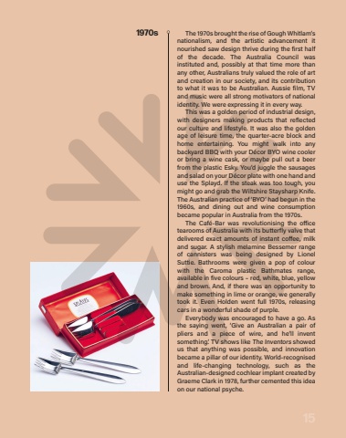 15The 1970s brought the rise of Gough Whitlam%u2019snationalism, and the artistic advancement itnourished saw design thrive during the first halfof the decade. The Australia Council wasinstituted and, possibly at that time more thanany other, Australians truly valued the role of artand creation in our society, and its contributionto what it was to be Australian. Aussie film, TVand music were all strong motivators of nationalidentity. We were expressing it in every way.This was a golden period of industrial design,with designers making products that reflectedour culture and lifestyle. It was also the goldenage of leisure time, the quarter-acre block andhome entertaining. You might walk into anybackyard BBQ with your D%u00e9cor BYO wine cooleror bring a wine cask, or maybe pull out a beerfrom the plastic Esky. You%u2019d juggle the sausagesand salad on your D%u00e9cor plate with one hand anduse the Splayd. If the steak was too tough, youmight go and grab the Wiltshire Staysharp Knife.The Australian practice of %u2018BYO%u2019 had begun in the1960s, and dining out and wine consumptionbecame popular in Australia from the 1970s.The Caf%u00e9-Bar was revolutionising the o%u00a0 icetearooms of Australia with its butterfly valve thatdelivered exact amounts of instant co%u00a0 ee, milkand sugar. A stylish melamine Bessemer rangeof cannisters was being designed by LionelSuttie. Bathrooms were given a pop of colourwith the Caroma plastic Bathmates range,available in five colours %u2013 red, white, blue, yellowand brown. And, if there was an opportunity tomake something in lime or orange, we generallytook it. Even Holden went full 1970s, releasingcars in a wonderful shade of purple.Everybody was encouraged to have a go. Asthe saying went, %u2018Give an Australian a pair ofpliers and a piece of wire, and he%u2019ll inventsomething.%u2019 TV shows like The Inventors showedus that anything was possible, and innovationbecame a pillar of our identity. World-recognisedand life-changing technology, such as theAustralian-designed cochlear implant created byGraeme Clark in 1978, further cemented this ideaon our national psyche.1970s