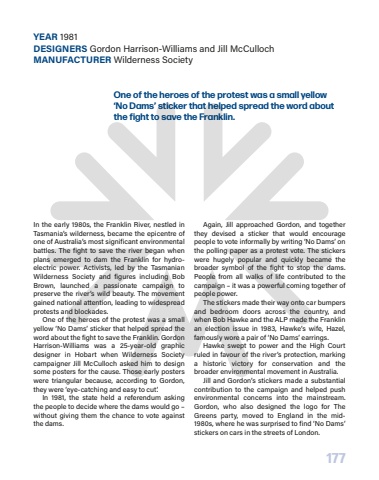 177In the early 1980s, the Franklin River, nestled in Tasmania%u2019s wilderness, became the epicentre of one of Australia%u2019s most significant environmental battles. The fight to save the river began when plans emerged to dam the Franklin for hydroelectric power. Activists, led by the Tasmanian Wilderness Society and figures including Bob Brown, launched a passionate campaign to preserve the river%u2019s wild beauty. The movement gained national attention, leading to widespread protests and blockades.One of the heroes of the protest was a small yellow %u2018No Dams%u2019 sticker that helped spread the word about the fight to save the Franklin. Gordon Harrison-Williams was a 25-year-old graphic designer in Hobart when Wilderness Society campaigner Jill McCulloch asked him to design some posters for the cause. Those early posters were triangular because, according to Gordon, they were %u2018eye-catching and easy to cut%u2019.In 1981, the state held a referendum asking the people to decide where the dams would go %u2013 without giving them the chance to vote against the dams.Again, Jill approached Gordon, and together they devised a sticker that would encourage people to vote informally by writing %u2018No Dams%u2019 on the polling paper as a protest vote. The stickers were hugely popular and quickly became the broader symbol of the fight to stop the dams. People from all walks of life contributed to the campaign %u2013 it was a powerful%u00a0coming together of people power.The stickers made their way onto car bumpers and bedroom doors across the country, and when Bob Hawke and the ALP made the Franklin an election issue in 1983, Hawke%u2019s wife, Hazel, famously wore a pair of %u2018No Dams%u2019 earrings.Hawke swept to power and the High Court ruled in favour of the river%u2019s protection, marking a historic victory for conservation and the broader environmental movement in Australia.Jill and Gordon%u2019s stickers made a substantial contribution to the campaign and helped push environmental concerns into the mainstream. Gordon, who also designed the logo for The Greens party, moved to England in the mid1980s, where he was surprised to find %u2018No Dams%u2019 stickers on cars in the streets of London.YEAR 1981DESIGNERS Gordon Harrison-Williams and Jill McCullochMANUFACTURER Wilderness SocietyOne of the heroes of the protest was a small yellow %u2018No Dams%u2019 sticker that helped spread the word about the fight to save the Franklin.