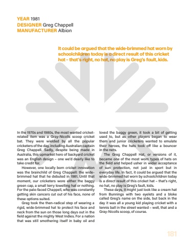 181It could be argued that the wide-brimmed hat worn by schoolchildren today is a direct result of this cricket hat %u2013 that%u2019s right, no hat, no play is Greg%u2019s fault, kids. In the 1970s and 1980s, the most wanted cricketrelated item was a Gray-Nicolls scoop cricket bat. They were wielded by all the popular cricketers of the day, including Australian captain Greg Chappell. Sadly, despite being made in Australia, this upmarket hero of backyard cricket was an English design %u2013 one we%u2019d dearly like to take credit for.However, one locally born cricket innovation was the brainchild of Greg Chappell: the widebrimmed hat that he debuted in 1981. Until that moment, our cricketers wore either the baggy green cap, a small terry towelling hat or nothing. For the pale-faced Chappell, who was constantly getting skin cancers cut out of his face, none of these options suited. Greg took the then-radical step of wearing a rigid, wide-brimmed hat to protect his face and neck from the sun on those long days out in the field against the mighty West Indies. For a nation that was still smothering itself in baby oil and loved the baggy green, it took a bit of getting used to, but as other players began to wear them%u00a0 and junior cricketers wanted to emulate their heroes, the hats took o%u00a0 like a bouncer in%u00a0the nets. The Greg Chappell Hat, or versions of it, became one of the most worn types of hats on the field and helped usher in wider acceptance of sun protection, not just in sport but in everyday life. In fact, it could be argued that the wide-brimmed hat worn by schoolchildren today is a direct result of this cricket hat %u2013 that%u2019s right, no hat, no play is Greg%u2019s fault, kids. These days, it might just look like a cream hat from Bunnings with two eyelets and a bloke called Greg%u2019s name on the side, but back in the day it was all a young kid playing cricket with a tennis ball in the street wanted %u2013 well, that and a%u00a0 Gray-Nicolls scoop, of course.YEAR 1981DESIGNER Greg ChappellMANUFACTURER Albion