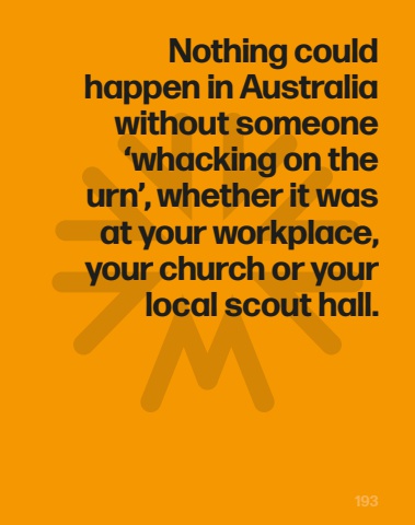 193Nothing could happen in Australia without someone %u2018whacking on the urn%u2019, whether it was at your workplace, your church or your local scout hall.