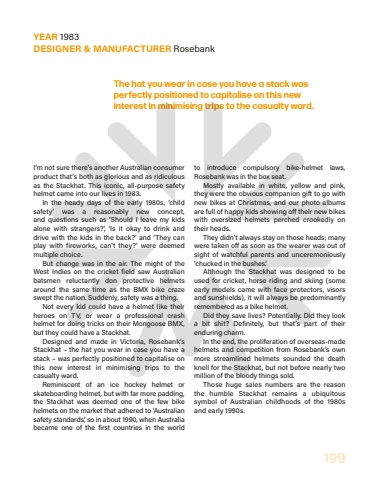 199I%u2019m not sure there%u2019s another Australian consumer product that%u2019s both as glorious and as ridiculous as the Stackhat. This iconic, all-purpose safety helmet came into our lives in 1983. In the heady days of the early 1980s, %u2018child safety%u2019 was a reasonably new concept, and%u00a0 questions such as %u2018Should I leave my kids alone with strangers?%u2019, %u2018Is it okay to drink and drive with the kids in the back?%u2019 and %u2018They can play with fireworks, can%u2019t they?%u2019 were deemed multiple choice. But change was in the air. The might of the West Indies on the cricket field saw Australian batsmen reluctantly don protective helmets around the same time as the BMX bike craze swept the nation. Suddenly, safety was a thing. Not every kid could have a helmet like their heroes on TV, or wear a professional crash helmet for doing tricks on their Mongoose BMX, but they could have a Stackhat. Designed and made in Victoria, Rosebank%u2019s Stackhat %u2013 the hat you wear in case you have a stack %u2013 was perfectly positioned to capitalise on this new interest in minimising trips to the casualty ward. Reminiscent of an ice hockey helmet or skateboarding helmet, but with far more padding, the Stackhat was deemed one of the few bike helmets on the market that adhered to %u2018Australian safety standards%u2019, so in about 1990, when Australia became one of the first countries in the world to%u00a0 introduce compulsory bike-helmet laws, Rosebank was in the box seat. Mostly available in white, yellow and pink, they were the obvious companion gift to go with new bikes at Christmas, and our photo albums are full of happy kids showing o%u00a0 their new bikes with oversized helmets perched crookedly on their heads.They didn%u2019t always stay on those heads; many were taken o%u00a0 as soon as the wearer was out of sight of watchful parents and unceremoniously %u2018chucked in the bushes%u2019. Although the Stackhat was designed to be used for cricket, horse riding and skiing (some early models came with face protectors, visors and sunshields), it will always be predominantly remembered as a bike helmet. Did they save lives? Potentially. Did they look a bit shit? Definitely, but that%u2019s part of their enduring charm. In the end, the proliferation of overseas-made helmets and competition from Rosebank%u2019s own more streamlined helmets sounded the death knell for the Stackhat, but not before nearly two million of the bloody things sold. Those huge sales numbers are the reason the humble Stackhat remains a ubiquitous symbol of Australian childhoods of the 1980s and early 1990s.YEAR 1983DESIGNER & MANUFACTURER RosebankThe hat you wear in case you have a stack was perfectly positioned to capitalise on this new interest in minimising trips to the casualty ward.