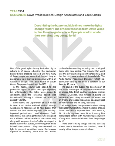 203Does hitting the buzzer multiple times make the lights change faster? The official response from David Wood is, %u2018No. It only registers once. If people want to waste their own time, they can go for it!%u2019One of the great sights in any Australian city or suburb is of people elbowing the pedestrian buzzer before crossing the road. But how many of those people are aware that the unit they so desperately want to avoid skin contact with is an Australian design icon, also found in South Africa, Singapore, Ireland and the US?In the 1960s, sound was added to the pedestrian lights to assist the sight-impaired, but unfortunately, the lights were prone to vandalism and the crossing sound was inconsistent, making it di%u00a0icult for users to correctly identify.In the 1980s, the Department of Main Roads in New South Wales enlisted Nielsen Design Associates to facilitate an all-new buzzer that worked for both vision-impaired and hearingimpaired pedestrians. Lead designer David Wood (yes, the same gentleman who designed the Caf%u00e9-Bar) added Braille to the arrow and, along with engineer Louis Challis, developed a tactile button that pulsed, confirming that it had indeed been pressed. They also removed the light to prevent vandalism, made the buzzers capable of receiving more than ten million pushes before needing servicing, and equipped them with new%u00a0 sonics. The thought that went into the development paid o%u00a0 handsomely, and the buzzers were embraced immediately. The Audio-Tactile Pedestrian Detector (which nobody ever calls it) has been a constant in our lives for 40%u00a0years.The sound of the buzzer has become part of our urban landscape. Its uniqueness wasn%u2019t lost on singer Billie Eilish and her producer brother Finneas O%u2019Connell, who noticed it during an Australian tour. They recorded the sound on an%u00a0iPhone and looped the sample as a drum beat on her number-one hit song, %u2018Bad Guy%u2019.Hit songs aside, the question is: does hitting the buzzer multiple times make the lights change faster? The o%u00a0icial response from David Wood is, %u2018No. It only registers once.%u2019 Does it annoy him that people persist with multiple taps anyway? %u2018If%u00a0they want to waste their own time, they can go for it!%u2019There aren%u2019t many things that you can say almost every Australian has touched, even if mostly with a jumper-covered elbow.YEAR 1984DESIGNERS David Wood (Nielsen Design Associates) and Louis Challis
