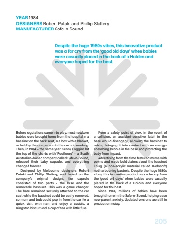 205Before regulations came into play, most newborn babies were brought home from the hospital in a bassinet on the back seat, in a box with a blanket, or held by the one person in the car not smoking. Then, in 1984 %u2013 the same year Kenny Loggins hit the top of the charts with%u00a0%u2018Footloose%u2019 %u2013 a South Australian%u2013based company called Safe-n-Sound, released their baby capsule, and everything changed forever.Designed by Melbourne designers Robert Pataki and Phillip Slattery, and based on the company%u2019s original design, the capsule consisted of two parts %u2013 the base and the removable bassinet. This was a game changer. The base remained securely attached to the car seat while the bassinet could be easily removed, so mum and bub could pop in from the car for a quick visit with nan and enjoy a cuddle, a Kingston biscuit and a cup of tea with little fuss.YEAR 1984DESIGNERS Robert Pataki and Phillip SlatteryMANUFACTURER Safe-n-SoundDespite the huge 1980s vibes, this innovative product was a far cry from the %u2018good old days%u2019 when babies were casually placed in the back of a Holden and everyone hoped for the best.From a safety point of view, in the event of a%u00a0 collision, an accident-sensitive latch in the base would disengage, allowing the bassinet to rotate, bringing it into contact with an energyabsorbing bubble in the base and protecting the baby from impact.Advertising from the time featured mums with perms and made bold claims about the bassinet lining (a non-acrylic material called Kodosoft) not harbouring bacteria. Despite the huge 1980s vibes, this innovative product was a far cry from the %u2018good old days%u2019 when babies were casually placed in the back of a Holden and everyone hoped for the best.Since 1984, millions of babies have been brought home in the Safe-n-Sound, helping ease new-parent anxiety. Updated versions are still in production today.