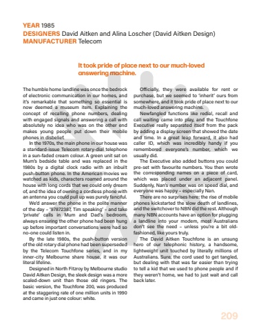 209The humble home landline was once the bedrock of electronic communication in our homes, and it%u2019s remarkable that something so essential is now deemed a museum item. Explaining the concept of recalling phone numbers, dealing with engaged signals and answering a call with absolutely no idea who was on the other end makes young people put down their mobile phones in disbelief.In the 1970s, the main phone in our house was a standard-issue Telecom rotary-dial telephone in a sun-faded cream colour. A green unit sat on Mum%u2019s bedside table and was replaced in the 1980s by a digital clock radio with an inbuilt push-button phone. In the American movies we watched as kids, characters roamed around the house with long cords that we could only dream of, and the idea of owning a cordless phone with an antenna you could pull up was purely fanciful.We%u2019d answer the phone in the polite manner of the day %u2013 %u201897872387, Tim speaking%u2019 %u2013 and take %u2018private%u2019 calls in Mum and Dad%u2019s bedroom, always ensuring the other phone had been hung up before important conversations were had so no-one could listen in.By the late 1980s, the push-button version of%u00a0the old rotary dial phone had been superseded by the Telecom Touchfone series, and in my inner-city Melbourne share house, it was our literal%u00a0lifeline.Designed in North Fitzroy by Melbourne studio David Aitken Design, the sleek design was a more scaled-down unit than those old ringers. The basic version, the Touchfone 200, was produced at the staggering rate of one million units in 1990 and came in just one colour: white.O%u00a0icially, they were available for rent or purchase, but we seemed to %u2018inherit%u2019 ours from somewhere, and it took pride of place next to our much-loved answering machine.Newfangled functions like redial, recall and call waiting came into play, and the Touchfone Executive really separated itself from the pack by adding a display screen that showed the date and time. In a great leap forward, it also had caller ID, which was incredibly handy if you remembered everyone%u2019s number, which we usually did.The Executive also added buttons you could pre-set with favourite numbers. You then wrote the corresponding names on a piece of card, which was placed under an adjacent panel. Suddenly, Nan%u2019s number was on speed dial, and everyone was happy %u2013 especially Nan.There are no surprises here: the rise of mobile phones kickstarted the slow death of landlines, and the switchover to NBN did the rest. Although many NBN accounts have an option for plugging a landline into your modem, most Australians don%u2019t see the need %u2013 unless you%u2019re a bit oldfashioned, like yours truly.The David Aitken Touchfone is an unsung hero of our telephonic history, a handsome, lightweight unit touched by literally millions of Australians. Sure, the cord used to get tangled, but dealing with that was far easier than trying to tell a kid that we used to phone people and if they weren%u2019t home, we had to just wait and call back later.YEAR 1985DESIGNERS David Aitken and Alina Loscher (David Aitken Design)MANUFACTURER TelecomIt took pride of place next to our much-loved answering machine.