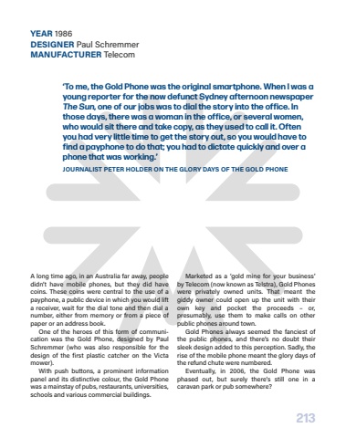 213A long time ago, in an Australia far away, people didn%u2019t have mobile phones, but they did have coins. These coins were central to the use of a payphone, a public device in which you would lift a receiver, wait for the dial tone and then dial a number, either from memory or from a piece of paper or an address book. One of the heroes of this form of communication was the Gold Phone, designed by Paul Schremmer (who was also responsible for the design of the first plastic catcher on the Victa mower). With push buttons, a prominent information panel and its distinctive colour, the Gold Phone was a mainstay of pubs, restaurants, universities, schools and various commercial buildings. Marketed as a %u2018gold mine for your business%u2019 by Telecom (now known as Telstra), Gold Phones were privately owned units. That meant the giddy owner could open up the unit with their own key and pocket the proceeds %u2013 or, presumably, use them to make calls on other public phones around town. Gold Phones always seemed the fanciest of the public phones, and there%u2019s no doubt their sleek design added to this perception. Sadly, the rise of the mobile phone meant the glory days of the refund chute were numbered.Eventually, in 2006, the Gold Phone was phased out, but surely there%u2019s still one in a caravan park or pub somewhere?%u2018To me, the Gold Phone was the original smartphone. When I was a young reporter for the now defunct Sydney afternoon newspaper The Sun, one of our jobs was to dial the story into the office. In those days, there was a woman in the office, or several women, who would sit there and take copy, as they used to call it. Often you had very little time to get the story out, so you would have to find a payphone to do that; you had to dictate quickly and over a phone that was working.%u2019%u0090ff%u0018%u0017%u0014%u0016%u001a%u000b%u000effi%u0013%u0015%u000e%u0015%u0017ffififffl%u0015%u0017ffiff%u0014ffi%u000efi%u0015ffiff%u0017%u0019ffifl%u0016%u0019%u000bffiff%u0009 %u000efi%u0015 fffl %u0013fiff%u0014%u0015ffiYEAR 1986DESIGNER Paul SchremmerMANUFACTURER Telecom