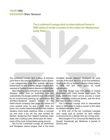 219The Lockheed Lounge shot to international fame in 1992 when it made a cameo in the video for Madonna%u2019s song %u2018Rain%u2019.The Lockheed Lounge isn%u2019t a piece of furniture you%u2019d find in the average Australian home. In fact, I can categorically state that nobody has ever kicked back on one of these design classics with a packet of Doritos to watch%u00a0Married at First Sight.Marc Newson sees himself as an international designer rather than an Australian one, but undoubtably his design aesthetic was influenced by his environment growing up, particularly the architect-designed project homes of the Pettit+Sevitt company (see page 36), where his mum worked when he was a child. Over the years, his London-based design firm has created toasters, bunk beds, watches, bikes, a concept car and even a jet. He has also worked for Qantas, designing their Skybed business class seats and creating some dinnerware for them %u2013 some of the most nicked plates going around.But it%u2019s the Lockheed Lounge, an aluminium and fibreglass chaise longue, that is his most heralded design. Newson displayed an early version of the seat, the LC1, at his first exhibition, Seating for Six, at Sydney%u2019s Roslyn Oxley Gallery in 1986. For two more years, he made refinements. The final design sees thin plates of riveted aluminium, with rivets beside each seam. The body, which the metal curves around, is made from fibreglass-reinforced plastic, and the three feet have a rubber coating.The Lockheed Lounge shot to international fame in 1992 when it made a cameo in the video for Madonna%u2019s song%u00a0%u2018Rain%u2019.In 2015, one of the ten Lockheed Lounges ever made sold at auction for $4.6 million, a%u00a0record price for a design item by a living artist.Who bought it? It%u2019s rumoured the Material Girl herself. Somebody get Madonna a packet of Doritos, stat.YEAR 1990DESIGNER Marc Newson