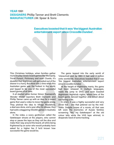 Executives boasted that it was %u2018the biggest Australian entertainment export since Crocodile Dundee%u2019.221This Christmas holidays, when families gather round to play classic board games like Monopoly, Trivial Pursuit, Pictionary and even Cluedo, it%u2019s doubtful that Nightmare will get pulled out of the drawer in a hurry. But there was a time when this Australian game was the hottest in the world, and tipped to be one of the most successful board games of all time.It all started when former Simon Townsend%u2019s Wonder World! reporters Brett Clements and Phillip Tanner came up with an idea for a board game that used a video to move the game along. They pitched the idea to Village Roadshow, a%u00a0deal was done, and a year after its release, they had sold a staggering 100,000 games in Australia alone.In the video, a scary gentleman called the Gatekeeper shouts at the players, who cannot stop or pause the tape as they roll the dice and make their way around the board, all while being frightened by an actor who would probably have asked for a higher fee if he%u2019d known how successful the game would be.YEAR 1991DESIGNERS Phillip Tanner and Brett ClementsMANUFACTURER J.W. Spear & SonsThe game tapped into the early world of %u2018interactive%u2019, and by 1993 it had sold 2 million units worldwide. Executives boasted that it was %u2018the biggest Australian entertainment export since Crocodile Dundee%u2019.At the height of Nightmare mania, the game had been released in multiple languages, made%u00a0 the jump to DVD, and even boasted Nightmare Nightclub nights, where fans of the board game danced together and talked about not having a life.In short, it was a highly successful and very clever fad %u2013 one that petered out by the mid1990s. Despite hopes of a movie, all that was left%u00a0 were the memories of Aussie families screaming %u2018Yes, my Gatekeeper!%u2019 at the old colour telly while the VHS tape whirred, in desperate need of some tracking.