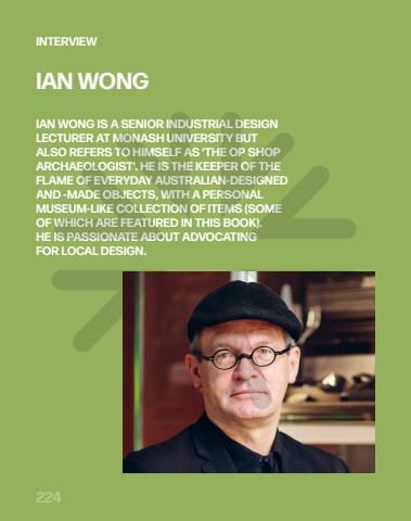 224INTERVIEWIAN WONG IS A SENIOR INDUSTRIAL DESIGNLECTURER AT MONASH UNIVERSITY BUTALSO REFERS TO HIMSELF AS %u2018THE OP SHOPARCHAEOLOGIST%u2019. HE IS THE KEEPER OF THEFLAME OF EVERYDAY AUSTRALIAN-DESIGNEDAND -MADE OBJECTS, WITH A PERSONALMUSEUM-LIKE COLLECTION OF ITEMS (SOMEOF WHICH ARE FEATURED IN THIS BOOK).HE IS PASSIONATE ABOUT ADVOCATINGFOR LOCAL DESIGN.IAN WONG