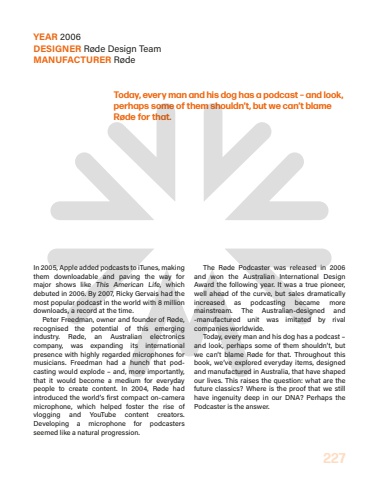 227Today, every man and his dog has a podcast %u2013 and look, perhaps some of them shouldn%u2019t, but we can%u2019t blame R%u00f8de for that.In 2005, Apple added podcasts to iTunes, making them downloadable and paving the way for major shows like%u00a0 This American Life, which debuted in 2006. By 2007, Ricky Gervais had the most popular podcast in the world with 8 million downloads, a record at the time.Peter Freedman, owner and founder of R%u00f8de, recognised the potential of this emerging industry. R%u00f8de, an Australian electronics company, was expanding its international presence with highly regarded microphones for musicians. Freedman had a hunch that podcasting would explode %u2013 and, more importantly, that it would become a medium for everyday people to create content. In 2004, R%u00f8de had introduced the world%u2019s first compact on-camera microphone, which helped foster the rise of vlogging and YouTube content creators. Developing a microphone for podcasters seemed like a natural progression.The R%u00f8de Podcaster was released in 2006 and won the Australian International Design Award the following year. It was a true pioneer, well ahead of the curve, but sales dramatically increased as podcasting became more mainstream. The Australian-designed and -manufactured unit was imitated by rival companies worldwide.Today, every man and his dog has a podcast %u2013 and look, perhaps some of them shouldn%u2019t, but we can%u2019t blame R%u00f8de for that. Throughout this book, we%u2019ve explored everyday items, designed and manufactured in Australia, that have shaped our lives. This raises the question: what are the future classics? Where is the proof that we still have ingenuity deep in our DNA? Perhaps the Podcaster is the answer.YEAR 2006DESIGNER R%u00f8de Design TeamMANUFACTURER R%u00f8de