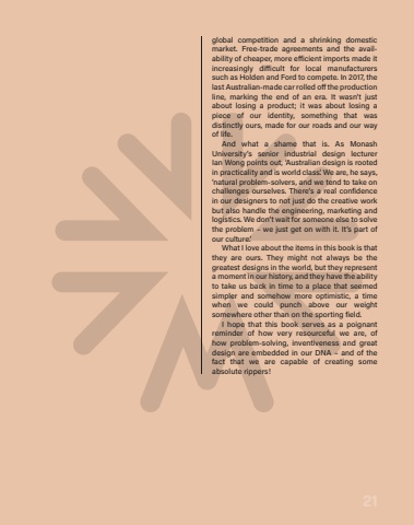 21global competition and a shrinking domestic market. Free-trade agreements and the availability of cheaper, more e%u00a0 icient imports made it increasingly di%u00a0 icult for local manufacturers such as Holden and Ford to compete. In 2017, the last Australian-made car rolled o%u00a0 the production line, marking the end of an era. It wasn%u2019t just about losing a product; it was about losing a piece of our identity, something that was distinctly ours, made for our roads and our way of life.And what a shame that is. As Monash University%u2019s senior industrial design lecturer Ian%u00a0Wong points out, %u2018Australian design is rooted in practicality and is world class%u2019. We are, he says, %u2018natural problem-solvers, and we tend to take on challenges ourselves. There%u2019s a real confidence in our designers to not just do the creative work but also handle the engineering, marketing and logistics. We don%u2019t wait for someone else to solve the problem %u2013 we just get on with it. It%u2019s part of our culture.%u2019 What I love about the items in this book is that they are ours. They might not always be the greatest designs in the world, but they represent a moment in our history, and they have the ability to take us back in time to a place that seemed simpler and somehow more optimistic, a time when we could punch above our weight somewhere other than on the sporting field. I hope that this book serves as a poignant reminder of how very resourceful we are, of how%u00a0 problem-solving, inventiveness and great design are embedded in our DNA %u2013 and of the fact that we are capable of creating some absolute rippers!