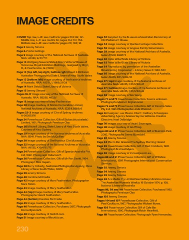 COVER Top row, L%u2013R: see credits for pages 200; 82; 191. Middle row, L%u2013R: see credits for pages 104; 131; 158. Bottom row, L%u2013R: see credits for pages 211; 108; 91.Page 2 Jeremy SimonsPage 6-7 John GollingsPage 9 Image courtesy of the National Archives of Australia. NAA: A6180, 9/2/77/1Page 10 Wolfgang Sievers/State Library Victoria/House of Tomorrow, Royal Exhibition Buildings, designed by Boyd, R., & Featherston, G. (1949)Page 13 (top left, top right, bottom right) David J. Hickson/Australian Photographic/State Library of New South WalesPage 13 (bottom left) Image courtesy of the National Archives of Australia. NAA: A12111, 1/1969/21/38Page 14 Mark Strizic/State Library of VictoriaPage 15 Jeremy SimonsPages 16-17 Image courtesy of the National Archives of Australia. NAA: B6295, 4032VPage 18 Image courtesy of Mary Featherston.Page 20 Image courtesy of Telstra Corporation Limited, National Archives of Australia. NAA: J2364, 9988/6Pages 22%u20133 Image courtesy of City of Sydney Archives: A-00059376Page 24 Powerhouse Collection. Gift of Stokes (Australasia) Limited, 1991. Photograph Penelope Clay.Page 26 Mitchell Library, State Library of New South Wales. Courtesy of Nino Sydney.Page 29 Image courtesy of the National Archives of Australia. NAA: B941. Photo by Ern McQuillan.Page 30 Image courtesy of Shellharbour City Museum.Page 32 Image courtesy of the National Archives of Australia. NAA: A6135, K10/4/81/75Page 34 Powerhouse Collection. Gift of Speedo Australia Pty Ltd, 1992. Photograph DatacomIT.Page 36 Powerhouse Collection. Gift of Mr Ron Sevitt, 1994. Photograph Max Dupain.Page 38 Barry Doherty, Australian Photographic Agency, State Library of New South Wales, 17670Page 39 Jeremy SimonsPage 40 Caroline McCrediePage 42 Image courtesy of Mary Featherston. Photographer Mark%u00a0Strizic.Page 43 Image courtesy of Mary Featherston.Page 44 (top) Image courtesy of Mary Featherston. Photographer Grant Featherston.Page 44 (bottom) Caroline McCrediePage 45 Image courtesy of Mary Featherston.Page 46 Powerhouse Collection. Purchased 2017. Photograph Emma Bjorndahl.Page 48 Image courtesy of Reckitt.com.Page 51 Image courtesy of Reckitt.com.Page 52 Supplied by the Museum of Australian Democracy at Old Parliament House.Page 54 Image courtesy of Qantas Heritage Collection.Page 56 Image courtesy of Angove Family Winemakers.Page 59 Image courtesy of the National Archives of Australia. NAA: A1500, K28673Page 60 Peter Wille/State Library of VictoriaPage 63 Peter Wille/State Library of VictoriaPage 64 Reproduced by permission of the Australian Broadcasting Corporation %u2013 Library Sales %u00a9 1965 ABCPage 66 Image courtesy of the National Archives of Australia. NAA: A6135, K31/5/82/51Page 67 (top) Image courtesy of the National Archives of Australia. NAA: A6135, K31/5/82/45Page 67 (bottom) Image courtesy of the National Archives of Australia. NAA: A6135, K31/5/82/49Page 68 Image courtesy of Ian Wong.Pages 70 and 71 Powerhouse Collection. Source unknown. Photographs Marinco Kojdanovski.Pages 72 and 73 Powerhouse Collection. Gift of Caroma Sales Pty Ltd, 1991. Photographs Linda Warlond.Page 74 Designer: Les Mason. Client: Cadbury Schweppes. Advertising Agency: Masius Wynne Williams. Creative Directive: Noel DelbridgePage 76 Images courtesy of Asahi Beverages.Page 78 Image courtesy of Ian Wong.Pages 80 and 81 Powerhouse Collection. Gift of Malcolm Park, 2003. Photographs Emma Bjorndahl.Page 82 Jeremy SimonsPage 84 Marco Del Grande/The Sydney Morning HeraldPage 85 Powerhouse Collection. Gift of Paul Cockburn, 1987. Photograph Michael Myers.Page 86 Image courtesy of invisedge.com.au.Pages 88 and 91 Powerhouse Collection. Gift of Wiltshire International, 1997. Photographs International Conservation Services.Page 92 Jeremy SimonsPage 94 Jeremy SimonsPage 95 Jeremy SimonsPage 96 Are Media Pty Limited/aremediasyndication.com.au/ The Australian Women%u2019s Weekly, 16 October 1974, p. 108, National Library of AustraliaPages 98, 99 and 101 Powerhouse Collection. Purchased 1992. Photographs Penelope Clay.Page 102 Jeremy SimonsPages 104 and 107 Powerhouse Collection. Gift of Paul%u00a0Cockburn, 1987. Photographs Michael Myers.Page 108 Powerhouse Collection. Gift of Cafe Bar International, 1990. Photograph Robin Hearfield.Page 111 Powerhouse Collection. Photograph Ryan Hernandez.230IMAGE CREDITS