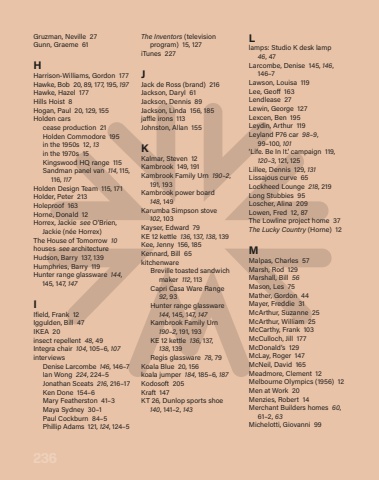 236Gruzman, Neville 27Gunn, Graeme 61HHarrison-Williams, Gordon 177Hawke, Bob 20, 89, 177, 195,%u00a0197Hawke, Hazel 177Hills Hoist 8Hogan, Paul 20, 129, 155Holden cars cease production 21 Holden Commodore 195 in the 1950s 12, 13 in the 1970s 15 Kingswood HQ range 115 Sandman panel van 114, 115, 116, 117Holden Design Team 115, 171Holder, Peter 213Holeproof 163Horne, Donald 12Horrex, Jackie see O%u2019Brien, Jackie (n%u00e9e Horrex)The House of Tomorrow 10houses see architectureHudson, Barry 137, 139Humphries, Barry 119Hunter range glassware 144, 145, 147, 147IIfield, Frank 12Iggulden, Bill 47IKEA 20insect repellent 48, 49Integra chair 104, 105%u20136, 107interviews Denise Larcombe 146, 146%u20137 Ian Wong 224, 224%u20135 Jonathan Sceats 216, 216%u201317 Ken Done 154%u20136 Mary Featherston 41%u20133 Maya Sydney 30%u20131 Paul Cockburn 84%u20135 Phillip Adams 121, 124, 124%u20135The Inventors (television program) 15, 127iTunes 227JJack de Ross (brand) 216Jackson, Daryl 61Jackson, Dennis 89Jackson, Linda 156, 185ja%u008b le irons 113Johnston, Allan 155KKalmar, Steven 12Kambrook 149, 191Kambrook Family Urn 190%u20132, 191, 193Kambrook power board 148,%u00a0149Karumba Simpson stove 102,%u00a0103Kayser, Edward 79KE 12 kettle 136, 137, 138, 139Kee, Jenny 156, 185Kennard, Bill 65kitchenware Breville toasted sandwich maker 112, 113 Capri Casa Ware Range 92,%u00a093 Hunter range glassware 144, 145, 147, 147 Kambrook Family Urn 190%u20132, 191, 193 KE 12 kettle 136, 137, 138,%u00a0139 Regis glassware 78, 79Koala Blue 20, 156koala jumper 184, 185%u20136, 187Kodosoft 205Kraft 147KT 26, Dunlop sports shoe 140, 141%u20132,%u00a0143Llamps: Studio K desk lamp 46, 47Larcombe, Denise 145, 146, 146%u20137Lawson, Louisa 119Lee, Geo%u008b 163Lendlease 27Lewin, George 127Lexcen, Ben 195Leydin, Arthur 119Leyland P76 car 98%u20139, 99%u2013100,%u00a0101%u2018Life. Be In It.%u2019 campaign 119, 120%u20133, 121, 125Lillee, Dennis 129, 131Lissajous curve 65Lockheed Lounge 218, 219Long Stubbies 95Loscher, Alina 209Lowen, Fred 12, 87The Lowline project home 37The Lucky Country (Horne) 12MMalpas, Charles 57Marsh, Rod 129Marshall, Bill 56Mason, Les 75Mather, Gordon 44Mayer, Freddie 31McArthur, Suzanne 25McArthur, William 25McCarthy, Frank 103McCulloch, Jill 177McDonald%u2019s 129McLay, Roger 147McNeil, David 165Meadmore, Clement 12Melbourne Olympics (1956) 12Men at Work 20Menzies, Robert 14Merchant Builders homes 60, 61%u20132, 63Michelotti, Giovanni 99