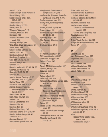 238Sebel 71, 105Sebel Design Merit Award 81Sebel, Harry 105Sebel Integra chair 104, 105%u20136,%u00a0107The Seekers 12Seidler, Harry 27, 53Sevitt, Ron 37%u2018Shaggin%u2019 Wagons%u2019 115Simcoe, Michael 171Simpson 103Skybed business class seat%u00a0%u00a0219Slattery, Phillip 205%u2018Slip, Slop, Slap%u2019 campaign 121Sloof, Joop 195Small Homes Service 37Smith, Dick 167Smithers, Ernest 113Snelling, Douglas 11Solo can 74, 75, 76, 77Somers, Daryl 151Speedo 33Speedo swimsuit 32, 33, 34, 35Spence, Catherine 119Splayds 15, 15, 24, 25Sporks 25sports shoes: Dunlop KT 26 runners 140, 141%u20132, 143Stable Table 159Stackhat 198, 199, 200%u20131stamp design: Famous Australian Women series 118%u201319, 119Stem chair 14, 44Stitt, Alex 119, 121, 125Stokes 25Stone, Constance 119Stones, Ellis 61Storrier, Tim 65Stubberfield, Jerry 141Stubbies shorts 94%u20136, 95, 97Studio K desk lamp 46, 47The Sun 213Sunday (Done) 157Sundowner panel van 115sunglasses: %u2018Palm Beach%u2019 sunglasses 214, 215surfboards: Thruster three-fin surfboard 172, 173%u20134, 175Surferoo panel van 115Surry Hills, Sydney (1986) 22%u20133Suttie, Lionel 15, 69, 93Swan Lager 151swimsuits: Speedo swimsuit 32, 33, 34, 35Sydney, Maya 30%u20131The Sydney Morning Herald 25, 37Sydney, Nino 27, 31TT4 hammock chair 87T21 lounge suite 86, 87Tabberer, Maggie 89Talbot, Peter 149Tandy 167Tandy TRS-80 computer 167Tanner, Phillip 221tapware 52, 53Tarax 75Tatler (club) 217Telecom 209, 213Telecom Touchfone series 208, 209%u201310, 211telephones Gold Phone 212, 213 Telecom Touchfone series 208, 209%u201310, 211televisions: Portable %u2018Model P4Z%u2019 black and white television 80, 81Tessa 87Tessa Model T4 hammock chair 87Tessa T21 chair and lounge 86, 87Thompson, Bruce 73, 165Thruster surfboard 172, 173%u20134,%u00a0175timer taps 188, 189toilets: Caroma dual-flush toilet 164%u20135, 165torches: Dolphin torch Mk II 82, 83, 85Tourism Australia 155tourism campaigns %u2018Chuck a shrimp on the barbie%u2019 155 %u2018Come and say g%u2019day%u2019 155Toyota Lexcen 195Travis, Peter 33Triton Work Centre 126, 127Truganini (Palawa woman) 119Twen 87VValiant cars 13van Oossanen, Peter 195Vegemite 147Victa 84Victa mower 213Village Roadshow 221Viners of She%u008b ield 25Vogel, Peter 151WWaterhouse, Doug 49Wesfarmers 95Wheels Car of the Year Award%u00a0%u00a099White, Patrick 12Whitlam, Gough 15Wilderness Society 177Wilkinson, Max 163Williams, Kim 65Williamson, John 20Wiltshire 89Wiltshire Staysharp Knife 15Wiltshire Staysharp Knife Mk II 88, 89%u201390, 91wine D%u00e9cor Wine Cooler 132, 133%u20134, 135 wine casks 56, 57