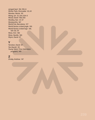 239winged keel 194, 195%u20136Winter Park, Doncaster 61, 63Wonder, Stevie 151Wong, Ian 21, 224, 224%u20135Wood, David 109, 203Woolley, Ken 27, 37Woolworths 167World Fair, Barcelona 217World Series cricket jingle 155World Series cricket logo 128, 129%u201330, 131Wran, Kim 185Wran, Neville 185Wynn, David 57YYencken, David 61Yes (band) 151Young Talent Time (television program) 149ZZinsky, Andrew 147