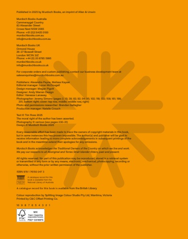 Published in 2025 by Murdoch Books, an imprint of Allen & UnwinMurdoch Books AustraliaCammeraygal Country83 Alexander StreetCrows Nest NSW 2065Phone: +61 (0)2 8425 0100murdochbooks.com.auinfo@murdochbooks.com.auMurdoch Books UKOrmond House26%u201327 Boswell StreetLondon WC1N 3JZPhone: +44 (0) 20 8785 5995murdochbooks.co.ukinfo@murdochbooks.co.ukFor corporate orders and custom publishing, contact our business development team atsalesenquiries@murdochbooks.com.auPublishers: Alexandra Payne, Melissa KayserEditorial manager: Loran McDougallDesign manager: Megan PigottDesigner: Andy Warren DesignEditor: Vanessa LanawayPhotographer: Jeremy Simons (pages 2; 15; 39; 82; 92; 94; 95; 102; 118; 132; 158; 161; 198;201, bottom right; cover: top row, middle; middle row, right)Photo and permissions researcher: Brendan GallagherProduction manager: Natalie CrouchText %u00a9 Tim Ross 2025The moral right of the author has been asserted.Photography %u00a9 various (see pages 230%u201331)Design %u00a9 Murdoch Books 2025Every reasonable e%u008b ort has been made to trace the owners of copyright materials in this book,but in some instances this has proven impossible. The author(s) and publisher will be glad toreceive information leading to more complete acknowledgements in subsequent printings of thebook and in the meantime extend their apologies for any omissions.Murdoch Books acknowledges the Traditional Owners of the Country on which we live and work.We pay our respects to all Aboriginal and Torres Strait Islander Elders, past and present.All rights reserved. No part of this publication may be reproduced, stored in a retrieval systemor transmitted in any form or by any means, electronic, mechanical, photocopying, recording orotherwise, without the prior written permission of the publisher.ISBN 978 1 76150 047 3A catalogue record for this book is available from the British LibraryColour reproduction by Splitting Image Colour Studio Pty Ltd, Wantirna, VictoriaPrinted by C&C O%u008b set Printing Co.10 9 8 7 6 5 4 3 2 1ISBN 978 1 76150 047 3 A catalogue record for this book is available from the British Library