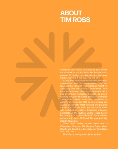 ABOUT TIM ROSSComedian Tim %u2018Rosso%u2019 Ross may be best known for his work on TV and radio, but he also has a passion for design, architecture and the glory days of Australia in the %u201860s, %u201870s and %u201880s.A long-time advocate for Australian modernist architecture and its conservation, Tim has received the National Trust Heritage Award for Advocacy and the National President%u2019s Prize from%u00a0the Australian Institute of Architects. He is also an honorary member of the latter. His awardwinning two-part television series on Australian architecture, Streets of Your Town, premiered on ABC TV in November 2016 to rave reviews and quickly became the most-watched arts program on the ABC for the year. His live%u00a0 show about why%u00a0 architecture matters, Designing a Legacy, premiered at the Sydney Opera House before becoming a TV show for the%u00a0ABC. Tim%u00a0also has a podcast with Kevin McCloud, Tim and Kev%u2019s Big Design Adventure!Tim%u2019s other books include Mum Had a Kingswood, Scorcher, The Rumpus Room, Motel, Bewdy and Chuck a U-Ey: Images of Australians and Their Cars. Find him on Instagram as @modernister.