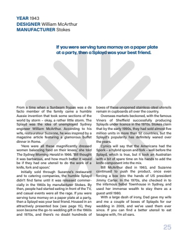 25From a time when a Sunbeam frypan was a de facto member of the family came a humble Aussie invention that took some sections of the world by storm %u2013 okay, a rather little storm. The Splayd was the idea of unemployed Sydney engineer William McArthur. According to his wife, restaurateur Suzanne, he was inspired by a magazine article featuring a glamorous bu%u00a0et dinner in Rome.%u2018Here were all these magnificently dressed women balancing food on their knees,%u2019 she told The Sydney Morning Herald in 1966. %u2018Bill thought it was barbarous, and how much better it would be if they had one utensil to do the work of a knife, fork and spoon.%u2019Initially sold through Suzanne%u2019s restaurant and to catering companies, the humble Splayd didn%u2019t find fame until it was released commercially in the 1960s by manufacturer Stokes. By then, people had started eating in front of the TV, and casual events were all the rage. If you were serving tuna mornay on a paper plate at a party, then a Splayd was your best friend. Housed in an attractively presented box (see page 15), they soon became the go-to wedding gift in the 1960s and 1970s, and there%u2019s no doubt hundreds of boxes of these unopened stainless-steel utensils remain in cupboards all over the country.Overseas markets beckoned, with the famous Viners of She%u00a0ield successfully producing Splayds under licence in the 1970s. Stokes claim that by the early 1990s, they had sold almost five million units in more than 52 countries, but the Splayd%u2019s popularity has definitely waned over the years.Cynics will say that the Americans had the Spork %u2013 a hybrid spoon and fork %u2013 well before the Splayd, which is true, but it took an Australian with a bit of spare time on his hands to add the knife component into the mix.Bill McArthur died in 1963, and Suzanne continued to push the product, once even forcing%u00a0 a box into the hands of US president Jimmy Carter. In the 1970s, she checked in to the%u00a0 infamous Sebel Townhouse in Sydney, and used her immense wealth to stay there as a guest until 1980.With a large dash of irony, Dad gave my wife and me a couple of boxes of Splayds for our wedding in 2009, and we%u2019ve used them ever since. If you can find a better utensil to eat lasagne with, I%u2019m all ears.YEAR 1943DESIGNER William McArthurMANUFACTURER StokesIf you were serving tuna mornay on a paper plate at a party, then a Splayd was your best friend.