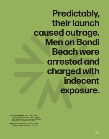 35Predictably, their launch caused outrage.Men on Bondi Beach were arrested and charged with indecent exposure.PREVIOUS SPREAD Hairy chests were optional when these two rowers donned their Speedos for a surf carnival at Wanda Beach, New South Wales, in 1981OPPOSITE Adventures in Speedo poster, made%u00a0by Speedo Australia, circa%u00a01975
