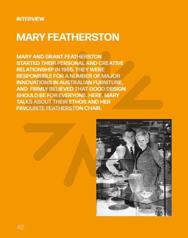 42INTERVIEWMARY AND GRANT FEATHERSTONSTARTED THEIR PERSONAL AND CREATIVERELATIONSHIP IN 1965. THEY WERERESPONSIBLE FOR A NUMBER OF MAJORINNOVATIONS IN AUSTRALIAN FURNITURE,AND FIRMLY BELIEVED THAT GOOD DESIGNSHOULD BE FOR EVERYONE. HERE, MARYTALKS ABOUT THEIR ETHOS AND HERFAVOURITE FEATHERSTON CHAIR.MARY FEATHERSTON
