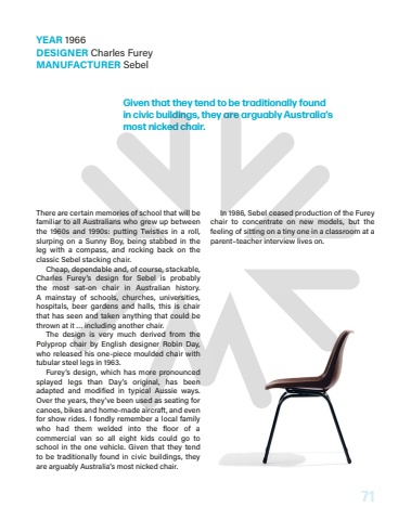 71Given that they tend to be traditionally found in civic buildings, they are arguably Australia%u2019s most nicked chair.There are certain memories of school that will be familiar to all Australians who grew up between the 1960s and 1990s: putting Twisties in a roll, slurping on a Sunny Boy, being stabbed in the leg with a compass, and rocking back on the classic Sebel stacking chair. Cheap, dependable and, of course, stackable, Charles Furey%u2019s design for Sebel is probably the%u00a0 most sat-on chair in Australian history. A%u00a0 mainstay of schools, churches, universities, hospitals, beer gardens and halls, this is chair that has seen and taken anything that could be thrown at it %u2026 including another chair. The design is very much derived from the Polyprop chair by English designer Robin Day, who released his one-piece moulded chair with tubular steel legs in 1963.Furey%u2019s design, which has more pronounced splayed legs than Day%u2019s original, has been adapted and modified in typical Aussie ways. Over the years, they%u2019ve been used as seating for canoes, bikes and home-made aircraft, and even for show rides. I fondly remember a local family who had them welded into the floor of a commercial van so all eight kids could go to school in the one vehicle. Given that they tend to%u00a0be traditionally found in civic buildings, they are arguably Australia%u2019s most nicked chair.YEAR 1966DESIGNER Charles FureyMANUFACTURER SebelIn 1986, Sebel ceased production of the Furey chair to concentrate on new models, but the feeling of sitting on a tiny one in a classroom at a parent%u2013teacher interview lives on.